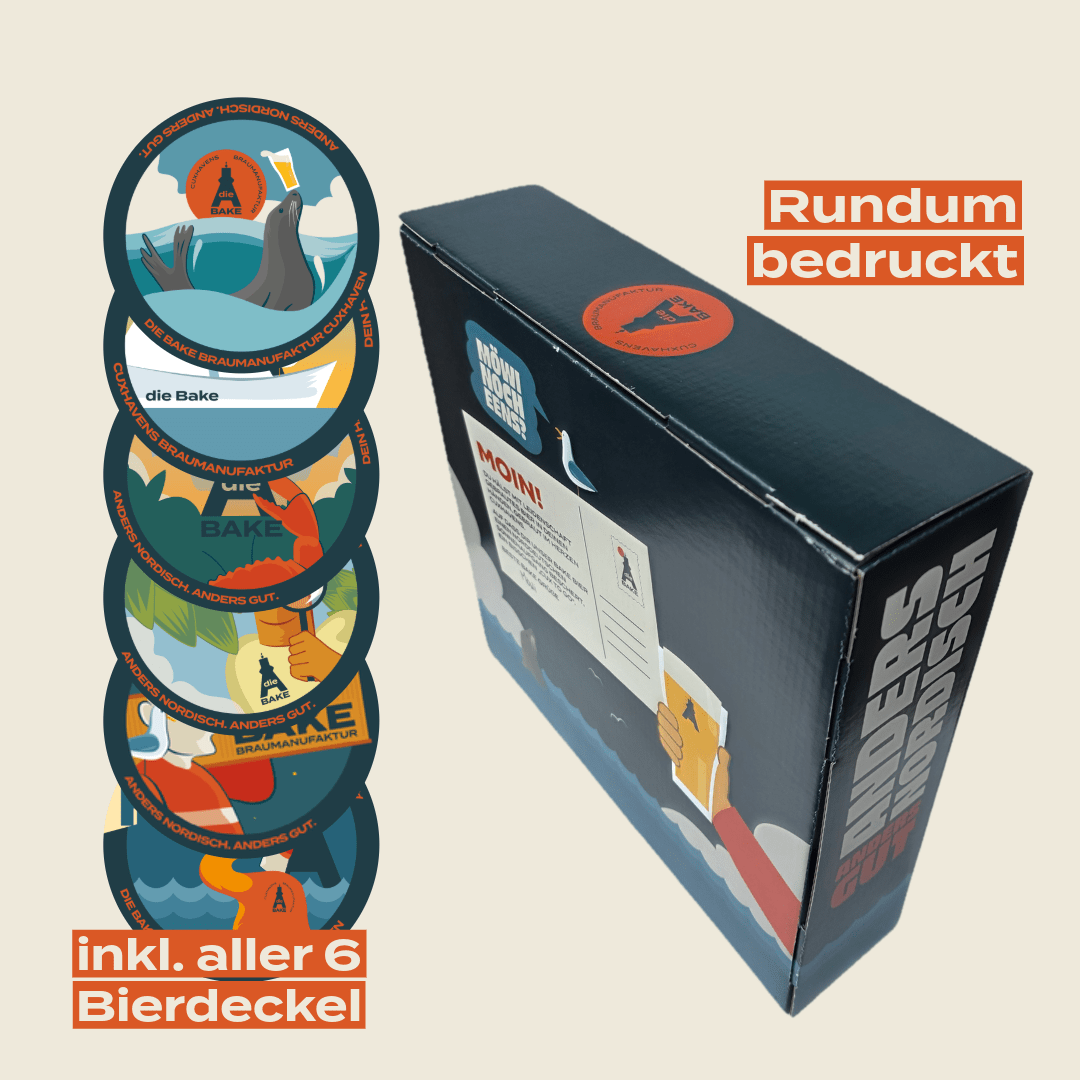 Rundum bedrucktes Geschenkpaket mit allen sechs Bieren, zwei 0,33l Gläsern und Bierdeckeln.